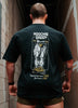 This tee has been garment dyed which results in a tee that not only has a much softer and high quality hand feel, and rich color but also doesn’t shrink after washing. Black shirt with a moss green and off white design.